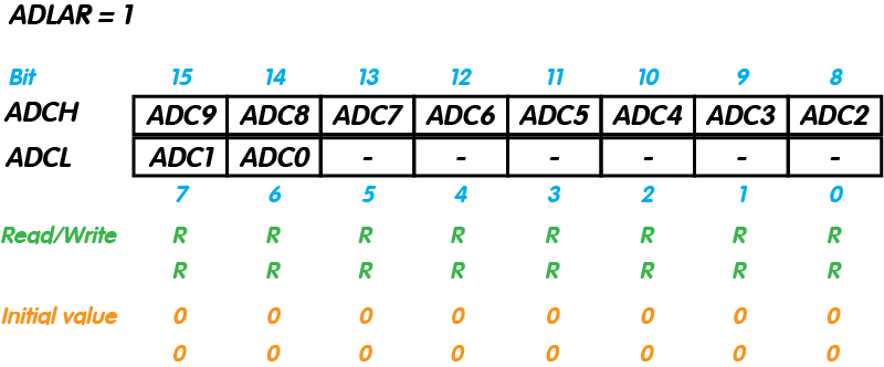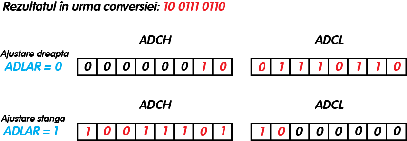 La sfârșitul fiecărei conversii complete de ADC, rezultatul poate fi găsit în cadrul acestor doi regiștrii. Așa cum am explicat și în cadrul registrului ADLAR, rezultatul final poate fi ajustat la stânga sau la dreapta, în funcție de preferințe. Mai jos se pot observa biții utilizați de către cei doi regiștrii în funcție de cele două moduri de ajustare:
