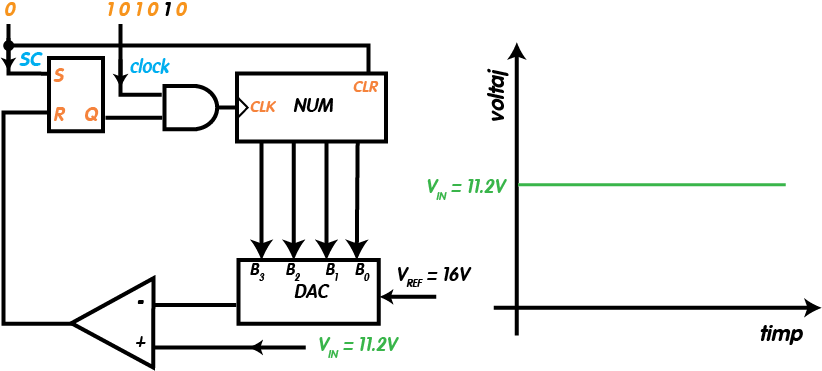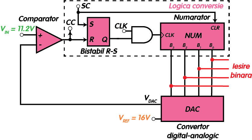 – la aplicarea comenzii de start conversie, SC, bistabilul R-S trece în starea 1 (ieșirea sa fiind setată în 1 logic), permițând impulsurilor de tact (CLK) trecerea prin poarta logică ȘI, iar numărătorul este inițializat;