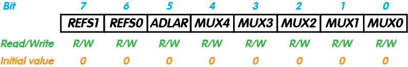 Acești biți sunt utilizați la selecția tensiunii de referință a ADC-ului. Dacă în timpul conversiei valoarea biților este schimbată, schimbarea va avea efect doar atunci când actuala conversie a fost încheiată. Avem la dispoziție următoarele combinații: