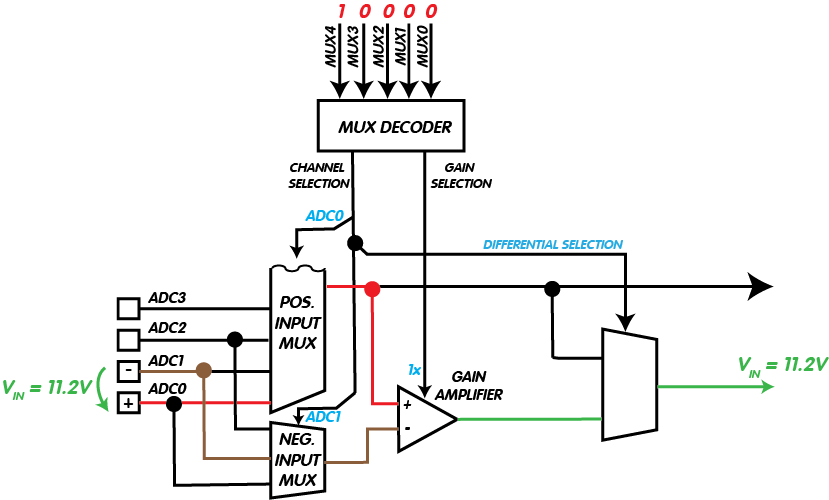 Un ADC setat să funcționeze în mod diferențial va măsura o cădere de tensiune între două intrări. Prin definiție, valoarea unui semnal diferențial este dată de valoarea tensiunii prezente între cele două borne: pozitivă și negativă. De exemplu, pentru conectarea unui senzor analogic de tip diferențial, borna pozitivă va fi legată pe o intrare pozitivă a ADC-ului (POS INPUT MUX), în timp ce borna negativă pe una din intrările asignate semnalelor negative (NEG INPUT MUX). De asemenea, ADC-ul este prevăzut cu un amplificator de semnal pentru a permite măsurarea tensiunilor foarte mici în regim diferențial.