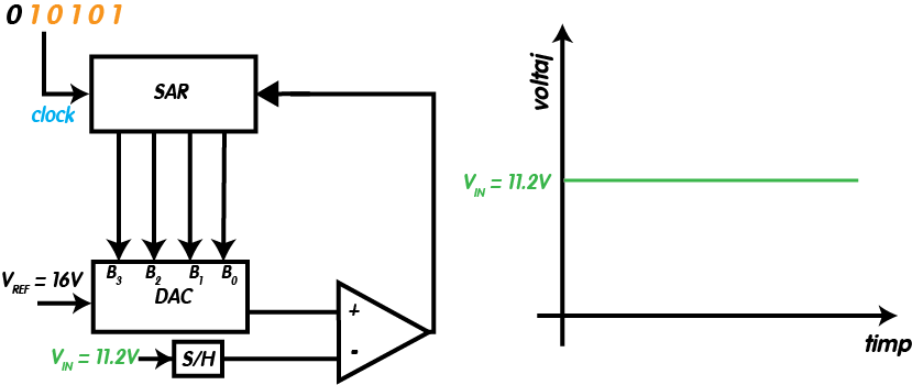 În figura de mai jos este prezentată schema principiului de funcționare a convertorului analog-digital cu aproximări succesive. Considerăm următorii parametrii: