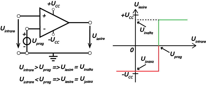 Comparatorul de tensiune este un circuit, care are două intrări și o singură ieșire, având structura unui amplificator operațional fără reacție (vom vedea mai târziu ce este amplificatorul operațional). Pe una din cele două intrări se aplică o tensiune fixă (denumită tensiune de prag), iar pe cealaltă intrare se aplică o tensiune care este comparată cu tensiunea de prag. În urma comparației se stabilește una din cele două valori posibile la ieșire, valori prezentate în ecuațiile din figura de mai jos: