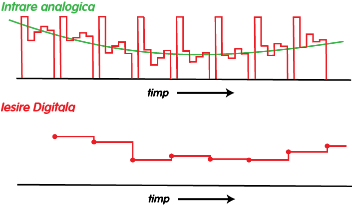 ADC-ul sau Convertorul Analog Digital, permite conversia unui semnal analogic într-o valoare digitală, valoare care mai apoi poate fi utilizată de microcontroler sau de un alt sistem de calcul. Știai că întreaga lume în care trăim este una analogică? Sunetul, lumina, temperatura, umiditatea până chiar și distanța, poziția și forța (lista poate continua) sunt mărimi (semnale) analogice. Pe de altă parte, un semnal digital este obținut prin eșantionarea unui semnal analogic, acesta fiind de forma 1 sau 0.