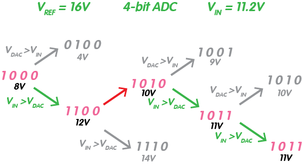 Această operație continuă până când fiecare bit din SAR a fost testat, fiind urmată de trimiterea semnalului de CC (conversie completă). Codul rezultat reprezintă aproximarea digitală a tensiunii de intrare eșantionate.