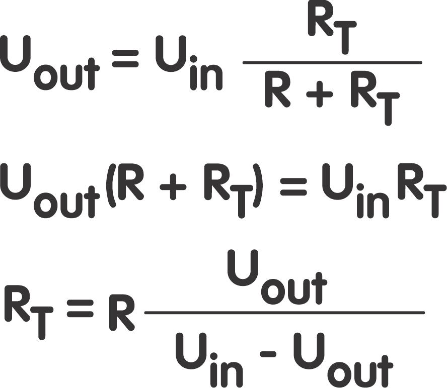 Din moment ce termistorul este o rezistență variabilă, tot ce trebuie să facem este să măsurăm valoarea rezistenței acestuia înainte de a-i putea calcula temperatura. Având în vedere faptul că microcontrolerul nu poate masura rezistențe electrice ci doar valori ale tensiunii electrice, acesta va măsura tensiunea dintre un punct al termistorului si o rezistență oarecare. Acest procedeu mai poartă denumirea de divizor de tensiune, având ilustrată ecuația în figura de mai jos (ecuația 1), unde: