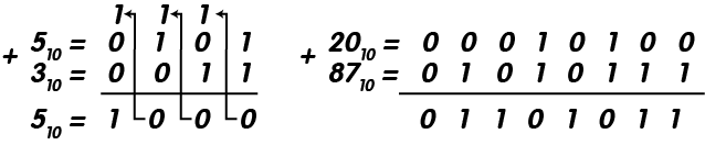 Adunarea a două numere binare se face exact ca cea a numerelor zecimale. Atunci când rezultatul adunării unei coloane este mai mare ca 1 (atunci când aduni 1 cu 1), rezultatul operației va fi egal cu 0, iar un 1 este adunat la următoarea coloană. De exemplu: