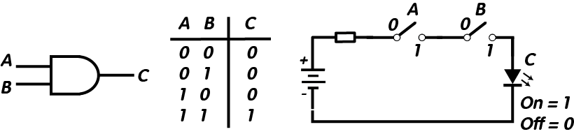 Formal, multiplicarea logică dă aceleași rezultate cu înmulțirea clasică. După cum se poate observa și în circuitul electric ilustrat mai sus, ieșirea C (reprezentată printr-un LED) va fi activă doar atunci când cele două intrări (A, respectiv B) vor fi în 1 logic. Vizualizând tabela de adevăr, observăm prezența a patru cazuri: