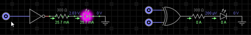 Ultima simulare prezintă mecanismul de funcționare al porților NOT și XOR. În partea stângă se poate observa că LED-ul stă aprins atât timp cât intrarea este blocată în 0 logic (specific porții NOT), iar în partea dreaptă doar atunci când întrările nu sunt identice (specific porții XOR).