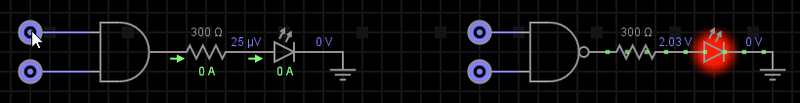 Am reprodus mai jos câte o simulare pentru fiecare poartă logică în parte. În prima simulare este exemplificat rolul unei porți logice AND în aprindearea unui LED. Ținând cont de tabela de adevăr a acestei porți, observăm că ieșirea va fi activă (și implicit LED-ul) atunci când ambele intrări sunt active. În cazul porții logice NAND, LED-ul va sta aprins atât timp cât ambele intrări nu sunt active.