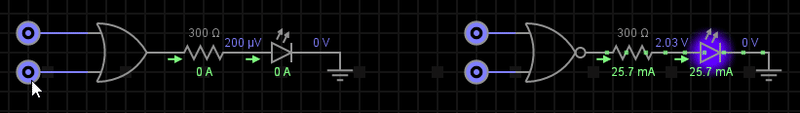 A doua simulare ilustreză de data aceasta principiul de funcționare a porților logice OR, respectiv NOR. În acest caz, LED-ul atașat pe ieșirea celor două porți logice va fi aprins atunci când: