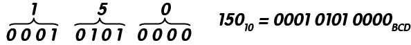 Numerele zecimale codificate binar sunt utilizate la reprezentarea unei cifre zecimale într-un grup de 4 cifre binare (biți) în același fel ca în cazul sistemului hexazecimal. De exemplu, numărul zecimal 150 este reprezentat în cod BCD astfel: