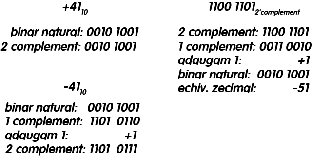 Cum se reprezintă un număr zecimal negativ în sistem binar? Prima soluție constă în utilizarea unui bit de semn. Această reprezentare este foarte simplă, fiind utilizată destul de rar. Ea constă în rezervarea unui bit (de obicei cel mai semnificativ) care ține cont de semnul numărului. Dacă bitul este zero, numărul este pozitiv; dacă bitul este egal cu unu, numărul este negativ. O variantă mult mai populară o constituie complementul față de 2. Pentru o întelegere cât mai ușoară a acestui procedeu, te învit să vizualizezi următorul exemplu: