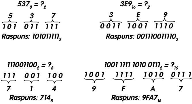 Din moment ce numerele binare stau la baza sistemelor digitale, în situațiile în care (să zicem că) avem de lucrat cu o serie foarte mare de astfel de numere, sistemul hexazecimal vine în ajutorul nostru, permițându-ne o întelegere și manipulare mult mai ușoară. Conversile hexazecimal – binar, octal-binar și viceversa sunt prezentate în imaginea următoare: