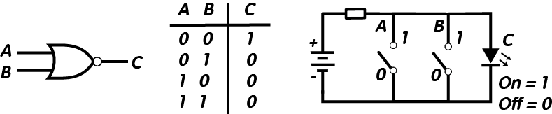 Asemenea operației NAND, operația NOR este compusă la rândul ei prin compunerea operației OR cu operația NOT. Aici, ieșirea va fi adevărată (1 logic) doar atunci când ambele intrări sunt false (0 logic). Se poate observa în figura de mai jos tabela de adevăr, simbolul precum și analogia sa cu cea a unui circuit electric.