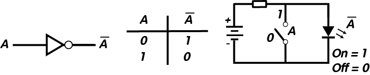 Făcând analogia cu un comutator, se poate oberva și în imaginea de mai sus că atunci când intrarea A este 0 (comutatorul este deschis), ieșirea (not A), reprezentată printr-un LED, va fi 1. În caz contrar, când intrarea A este 1, ieșirea va fi 0.