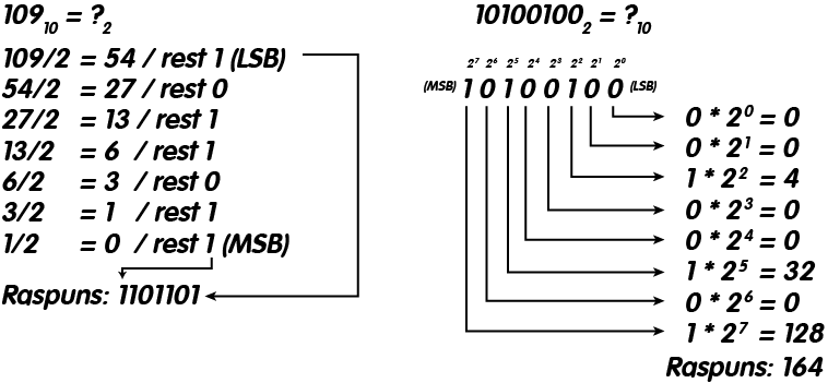 Cel mai din stânga bit poartă denumirea de cel mai semnificativ bit, iar cel mai din dreapta de, cel mai puțin semnificativ bit. Metoda de conversie din sistem zecimal în sistem binar și invers este prezentată în figura de mai jos: